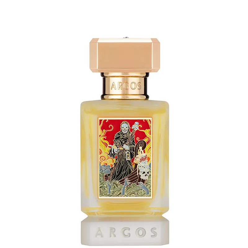Флаконът на Charon’s Vail следва престижната визуална идентичност на Argos — тежко прозрачено стъкло с фасетирани ръбове, вписващо в центъра си характерната метална плочка с релефен митологичен мотив, този път представящ символика, свързана с Харон и пътя между световете. Капачката е масивна метална, с фин релеф и усещане за артефакт – естетика, която подчертава мистичния характер на аромата.