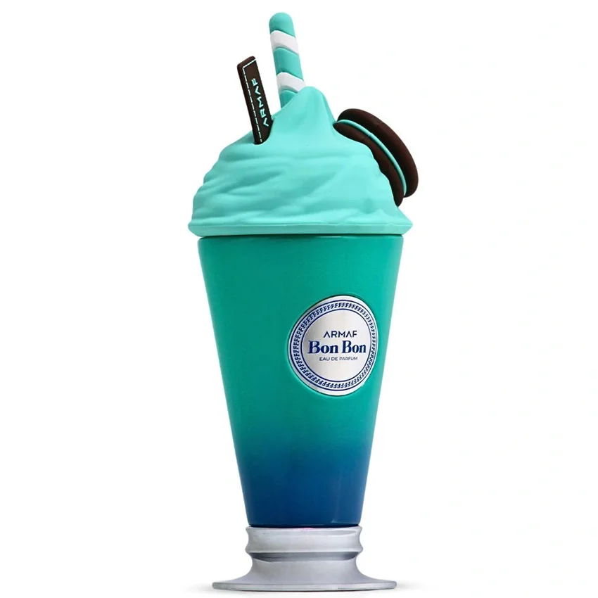 Флаконът на Armaf Delights Bon Bon е оформен като стилизиран десертен шейк. Силуетът наподобява висока чаша с разширение в горната част, завършваща с декоративен „топинг“ във форма на сметанов вихър. През горната част преминава декоративна сламка, а отпред е поставен кръгъл медальон с името Bon Bon. Цветовата доминанта е тюркоазено-аква тон, комбиниран с метализирана основа, което създава ясно разпознаваема и тематична визия.