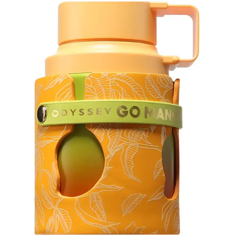 Флаконът на Armaf Odyssey Go Mango е оформен като спортен термос с цилиндричен корпус и интегрирана дръжка, което подчертава неговия „on-the-go“ характер. Външната обвивка е в наситено оранжево с релефен мотив на мангови листа, а централният отвор с форма на манго разкрива вътрешната бутилка в жълто-зелени тонове. Зелен ремък с надпис Odyssey Go Mango допълва outdoor естетиката и превръща флакона в хибрид между парфюм и аксесоар.