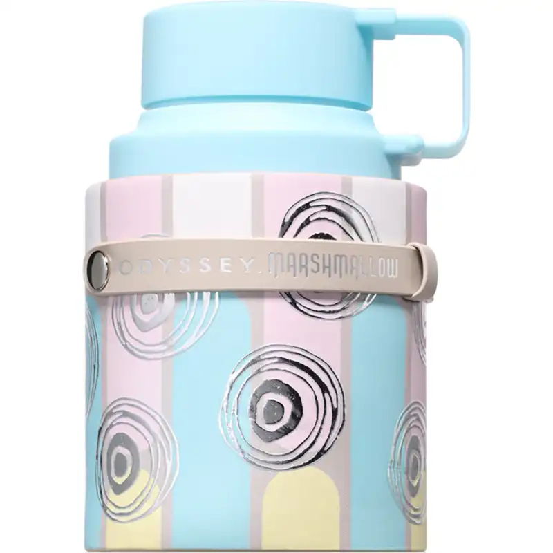 Флаконът на Armaf Odyssey Marshmallow следва характерната „on-the-go“ естетика на серията Odyssey, с форма, наподобяваща термос или бутилка за напитки. Корпусът е цилиндричен с интегрирана дръжка, а цветовата палитра е изградена от меки, пастелни и захарни тонове, които визуално подсилват гурме концепцията на аромата. Декоративните графични елементи напомнят сладкарски мотиви и ясно комуникират десертния характер на композицията.