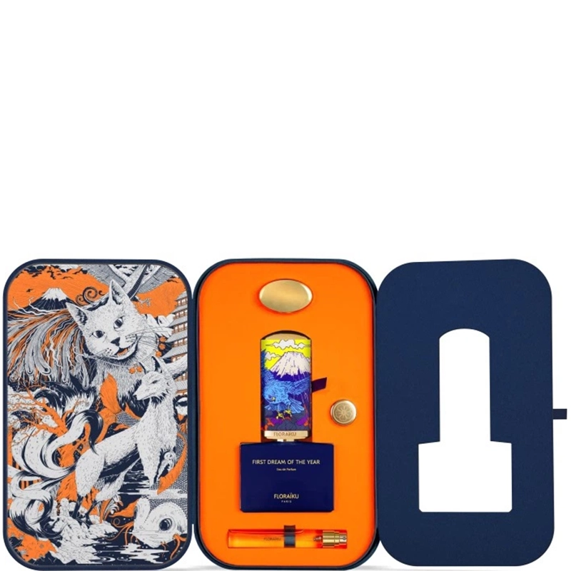 Флаконът на Floraïku First Dream of the Year е в характерния за Enigmatic Flowers цвят индигово синьо, с нежен японски акварел. В комплекта се включват флакон 50 мл и пътен спрей 10 мл.