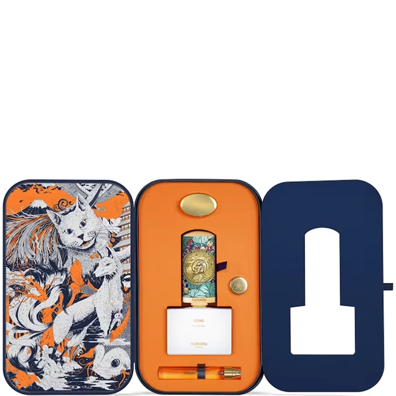 Флаконът на Floraïku Gong е с акварел, вдъхновен от японското изкуство и ритуалния инструмент гонг. В комплекта се включват флакон 50 мл и пътен спрей 10 мл.
