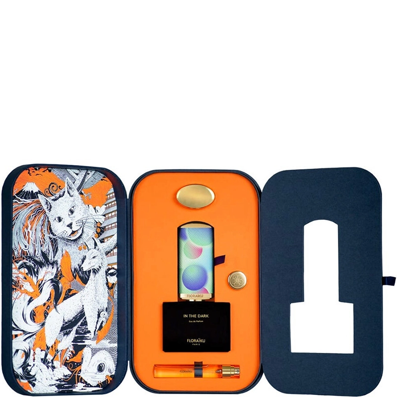 Флаконът на Floraïku In the Dark е с тъмен японски акварел, подходящ за нощния, мистичен характер на аромата. В комплекта се включват флакон 50 мл и пътен спрей 10 мл.
