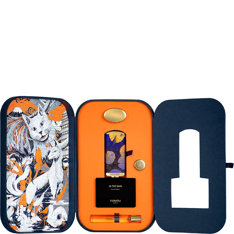 Флаконът на Floraïku In the Rain е с японски акварел в сиво-синьо, отразяващ дъждовния, меланхоличен характер на аромата. В комплекта се включват флакон 50 мл и пътен спрей 10 мл.