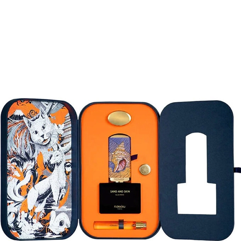 Флаконът на Floraïku Sand and Skin е с акварел в топли пясъчни и златисти тонове, отразяващ плажния, чувствен характер на аромата. В комплекта се включват флакон 50 мл и пътен спрей 10 мл.