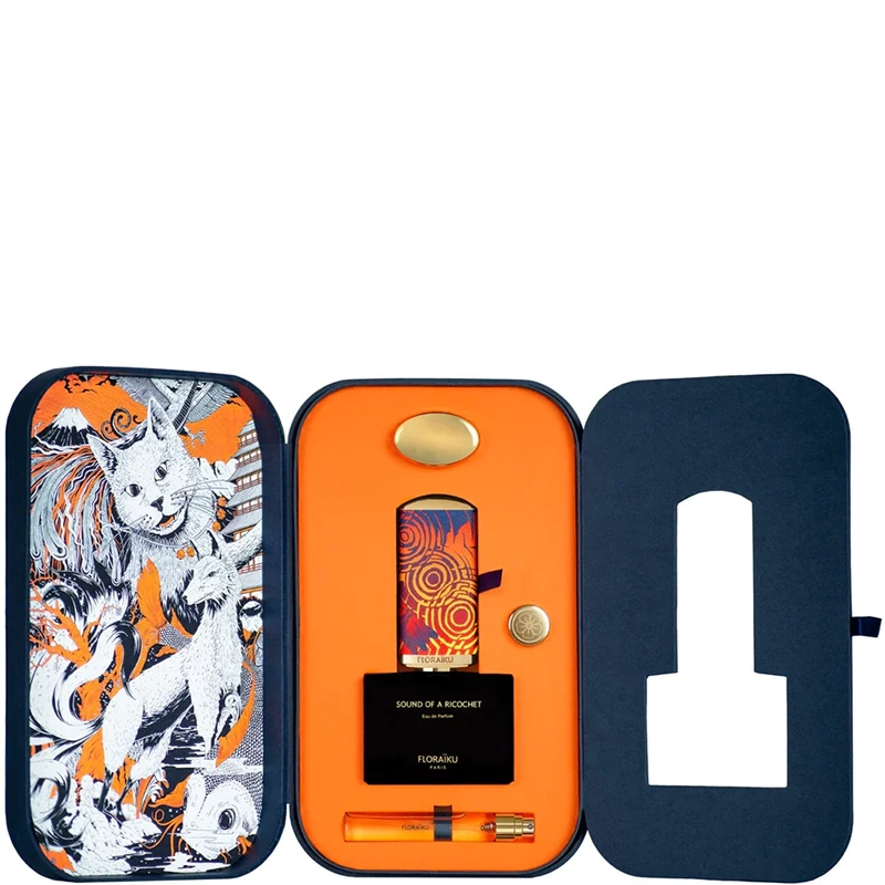 Флаконът на Floraïku Sound of a Ricochet носи акварел с образа на червена водна кончица под горещото небе — поетичен японски образ, вдъхновил хайку на аромата. В комплекта се включват флакон 50 мл и пътен спрей 10 мл.