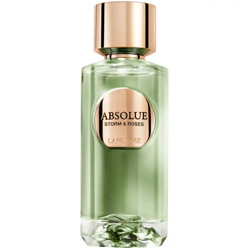 Флаконът на Lancôme Absolue Les Parfums Storm & Roses визуално отразява напълно концепцията за буря и свежест. Стъкленото тяло е оцветено в прозрачен зелен градиент, напомнящ за мокра растителност и свежа листна маса след дъжд. Формата е издължена и елегантна, с масивно дъно и декоративни стъклени елементи, които наподобяват застинали капки. Централният кръгъл медальон в златист метален финиш с надпис „Absolue Storm & Roses“ създава контраст между свежата цветност и луксозната рамка, а цилиндричната златна капачка с огледално покритие завършва дизайна с усещане за баланс и завършеност.