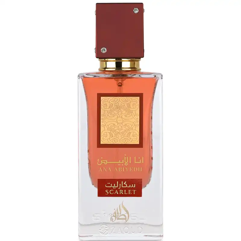 Lattafa Ana Abiyedh Scarlet е модерен дамски парфюм, представен през 2025 година, който се отличава със своя смел и пристрастяващ гурме характер. Вдъхновен от образа на „femme fatale“, ароматът е създаден за съвременната жена, която излъчва мистериозна съблазън и увереност. Композицията се открива с отличителна и сочна нотка на черна череша, чиято сладост е деликатно „ужилена“ от свежата пикантност на розов пипер. В сърцевината разцъфтява елегантен флорален букет от кадифена бяла роза и нежен божур, затоплен от кремообразната прегръдка на тонка и щипка индийско орехче. Финалът е плътен и съблазнителен, като богатата база от карамел, захар и ванилия е балансирана от тъмната дълбочина на земно пачули, което придава изключителна трайност и характер. Флаконът следва изчистения, минималистичен силует на колекцията Ana Abiyedh. Масивната стъклена бутилка е увенчана с текстурирана сребърна капачка, а акцентът пада върху яркочервената плочка с името на аромата, която визуално подсказва за неговия страстен и интензивен характер. Със своя наситен и топъл профил, Lattafa Ana Abiyedh Scarlet е идеален избор за вечерни поводи и по-хладните месеци. Той е създаден за дамата, която не се страхува да бъде в центъра на вниманието, оставяйки след себе си смела и запомняща се следа. Връхни нотки: черна череша, розов пипер