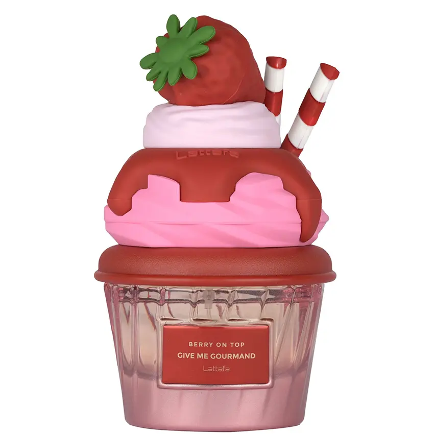 Lattafa Berry On Top е изкусителен дамски парфюм от колекцията "Give Me Gourmand", лансиран през 2025 година. Това е един закачлив и сладък аромат, създаден за дамите, които обичат гурме уханията и не се страхуват да се потопят в света на апетитните десерти. Композицията се открива с неустоима експлозия от свежа ягода и пухкава бита сметана, която моментално създава усещане за вкусен летен сладкиш. Сърцевината задълбочава сладостта с нотки на карамелизирана захар и домашно сладко от ягоди, като деликатният акцент на бели цветя добавя фина елегантност и баланс. Финалът е мек и успокояващ, като топлата ванилия и чистият мускус създават комфортна и дълготрайна основа. Флаконът е истинско бижу за всеки любител на гурме ароматите. Дизайнът му е вдъхновен от апетитен къпкейк – основата наподобява хартиена формичка, а капачката е като глазура, поръсена с цветни пръчици. Розовият цвят перфектно отразява ягодовата тема на парфюма. Със своя ярък и весел характер, Berry On Top е идеален за ежедневно носене, особено през топлите месеци, когато искате да оставите сладко, позитивно и запомнящо се впечатление. Връхни нотки: ягода, бита сметана