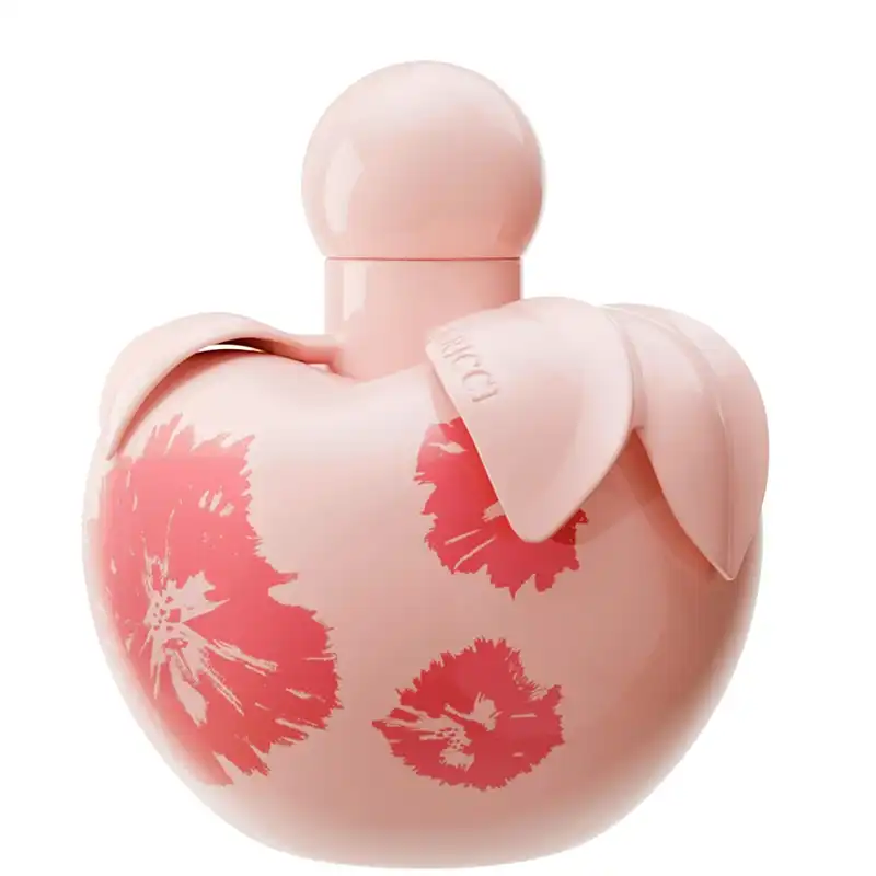 Флаконът на Nina Fleur следва емблематичната ябълкова форма, но тук е украсен с флорални мотиви и пастелни тонове, вдъхновени от модната къща Nina Ricci и нейната любов към природата, женствеността и естетиката.